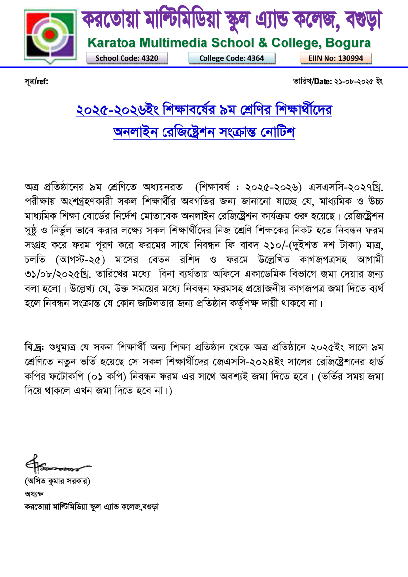 **২০২৫-২০২৬ইং শিক্ষাবর্ষের ৯ম শ্রেণির শিক্ষার্থীদের অনলাইন রেজিষ্ট্রেশন সংক্রান্ত নোটিশ**