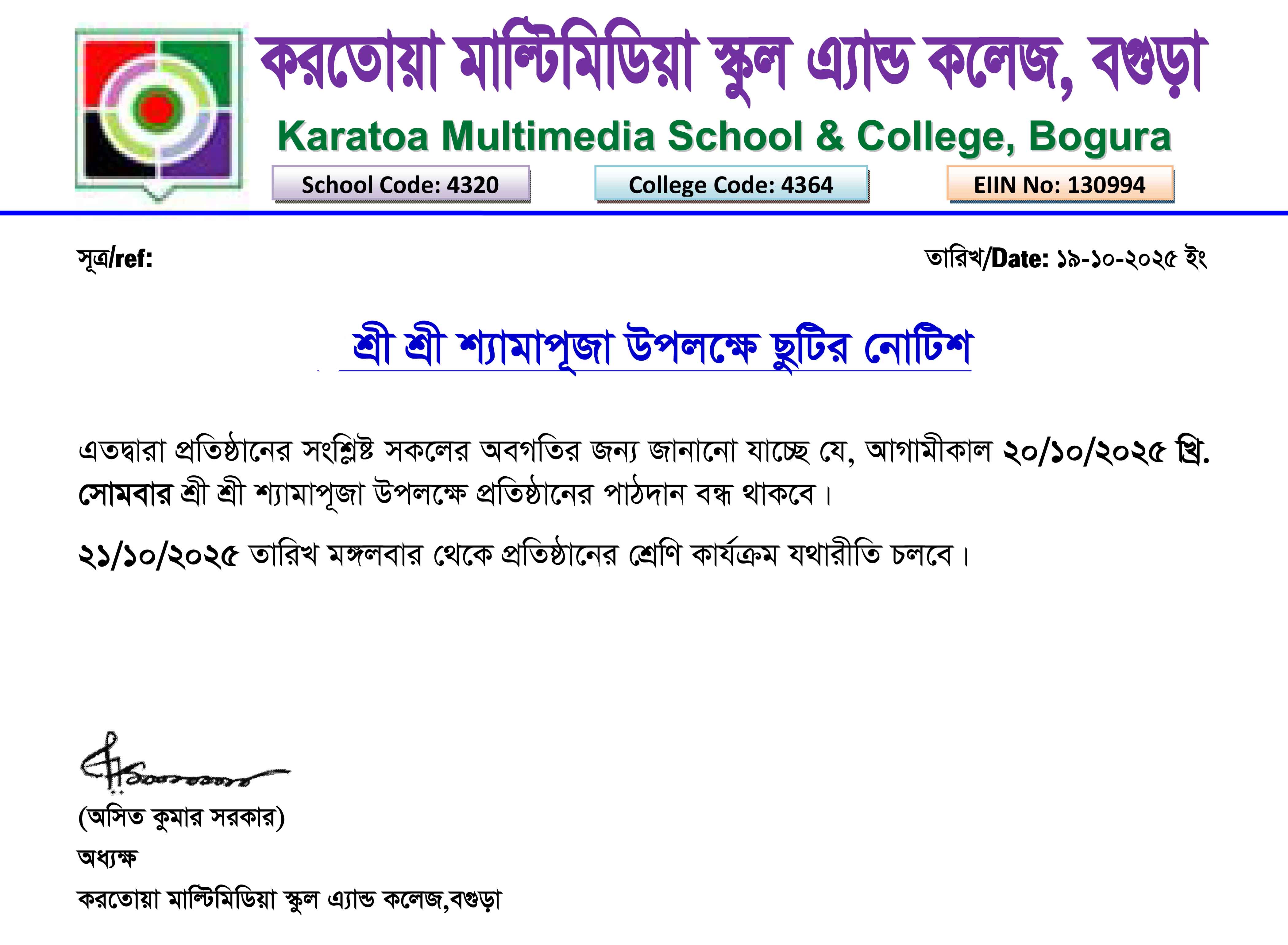 শ্রী শ্রী শ্যামা পূজা উপলক্ষে ছুটির নোটিশ